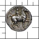 ΦΙΛΙΠ-ΠΟΥ // Ν [PHILIPPOU]. Unbekleideter unbärtiger Reiter auf Pferd nach rechts, in seiner Rechten ein Palmwedel, seine Linke am Zügel, auf Standlinie, unten Blitzbündel, in Vollkreis.